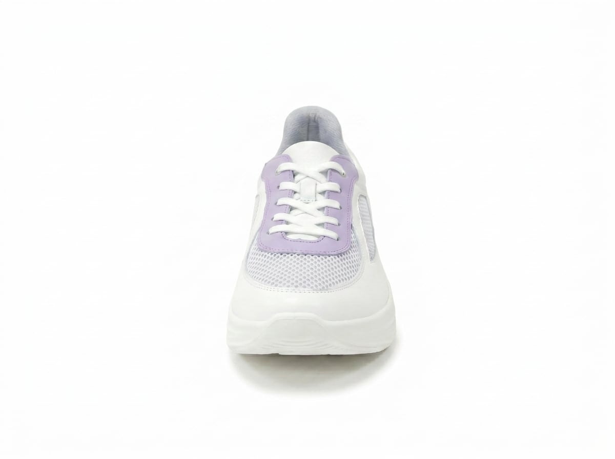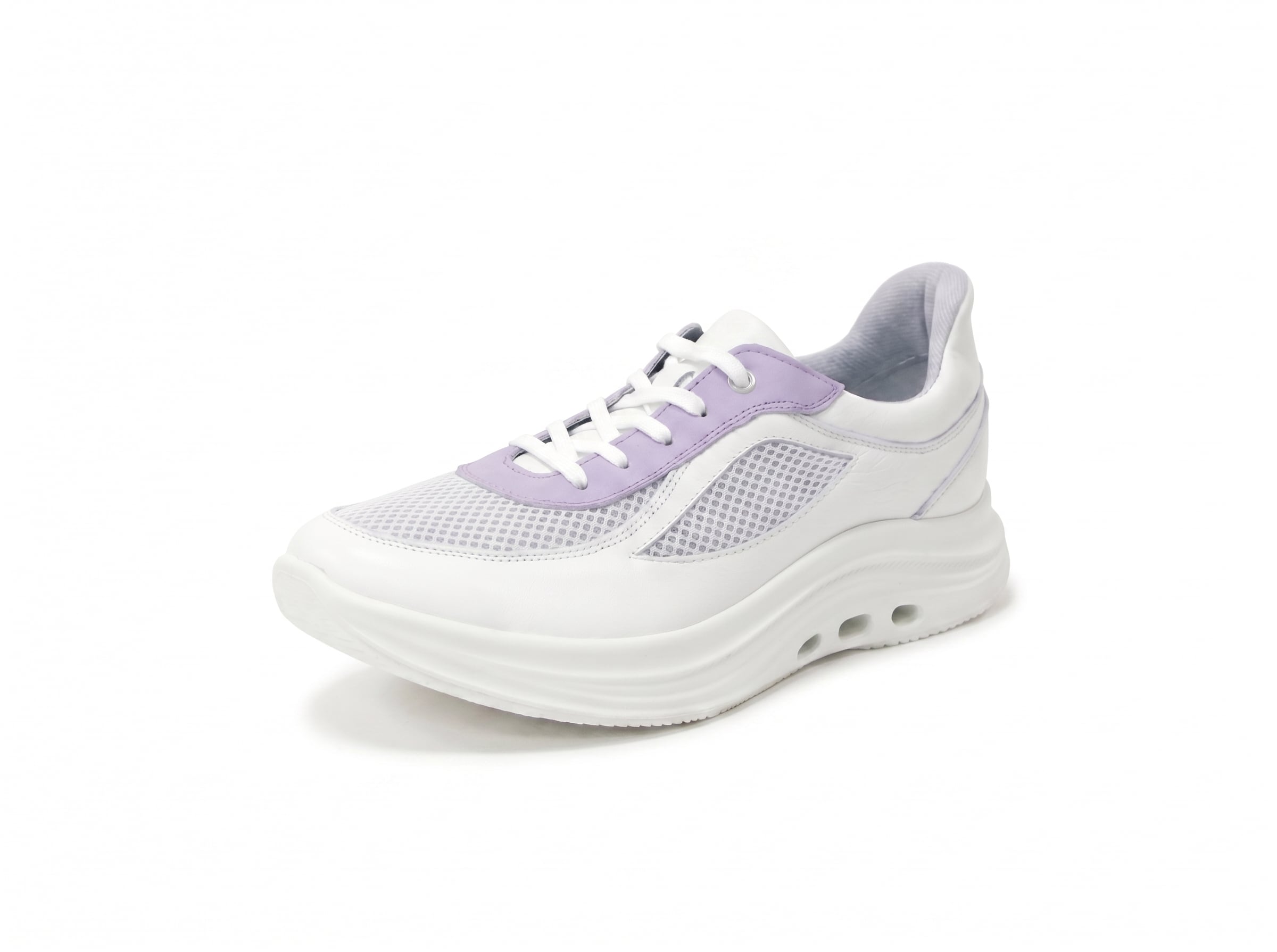 また、このモデルはアッパーに葉を思わせるような流れるラインを取り入れ、軽やかさの中にやわらかく上品な表情を添えています。メッシュ×レザーの異素材使いに、さりげない個性とデザイン性を加えた一足です。
